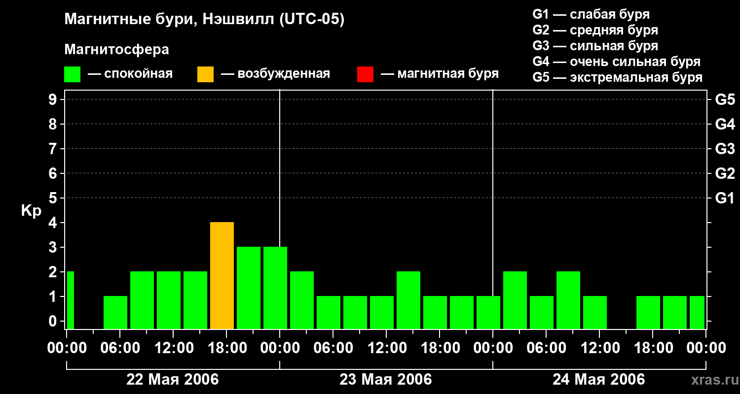 Изменения геомагнитного индекса Kp с 22 по 24 мая 2006 года для средних широт