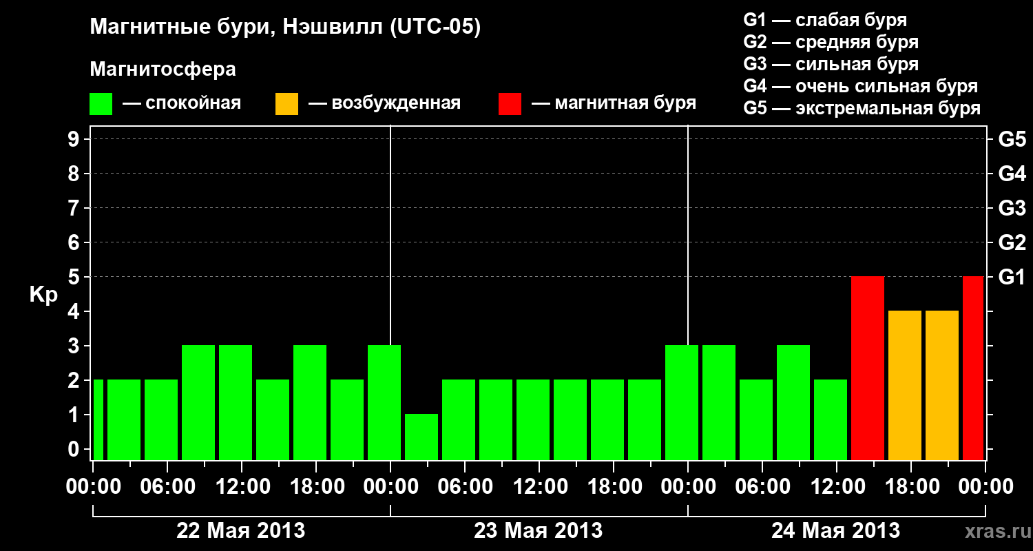 Изменения геомагнитного индекса Kp с 22 по 24 мая 2013 года для средних широт