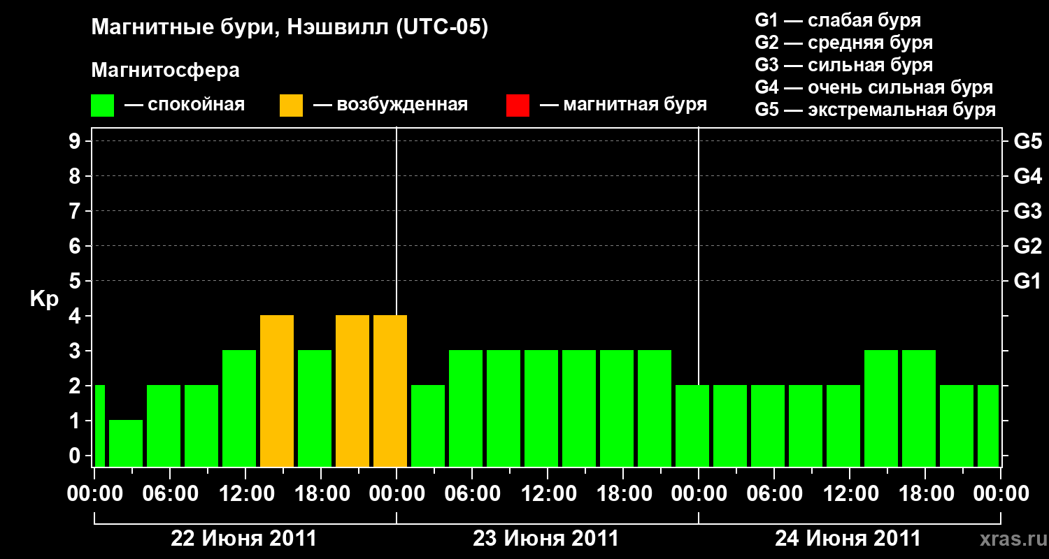 Изменения геомагнитного индекса Kp с 22 по 24 июня 2011 года для средних широт