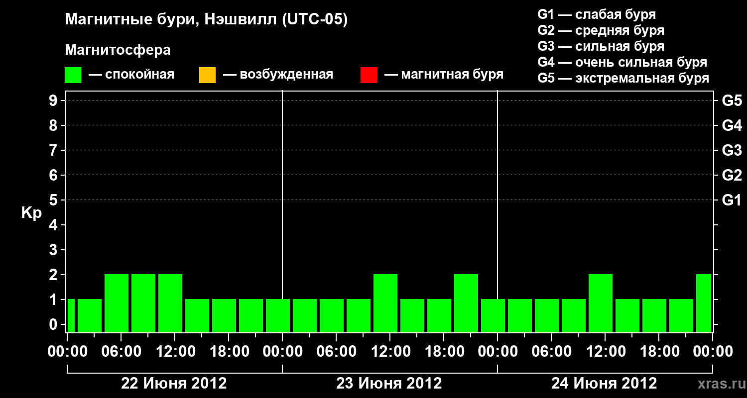 Изменения геомагнитного индекса Kp с 22 по 24 июня 2012 года для средних широт
