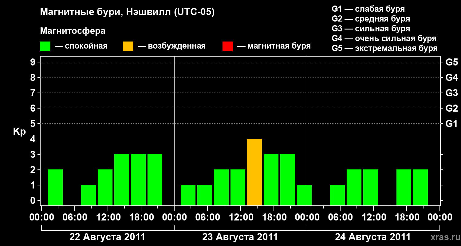 Изменения геомагнитного индекса Kp с 22 по 24 августа 2011 года для средних широт
