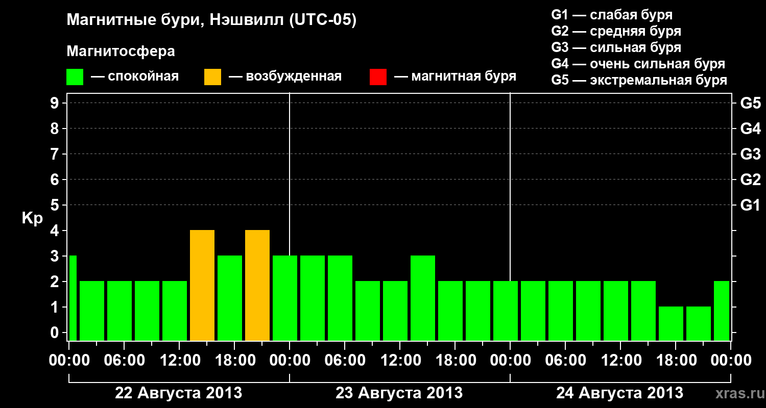 Изменения геомагнитного индекса Kp с 22 по 24 августа 2013 года для средних широт