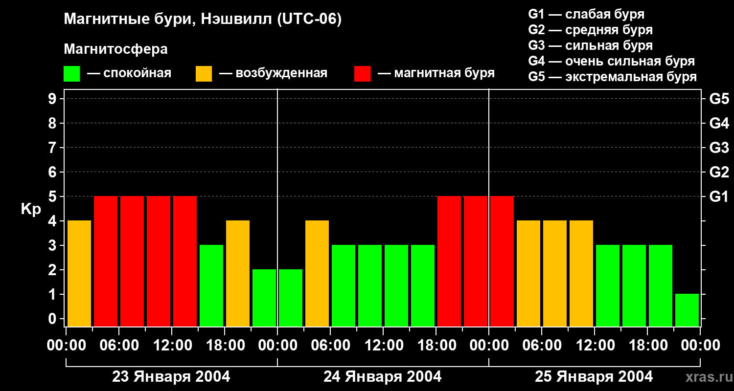 Изменения геомагнитного индекса Kp с 23 по 25 января 2004 года для средних широт