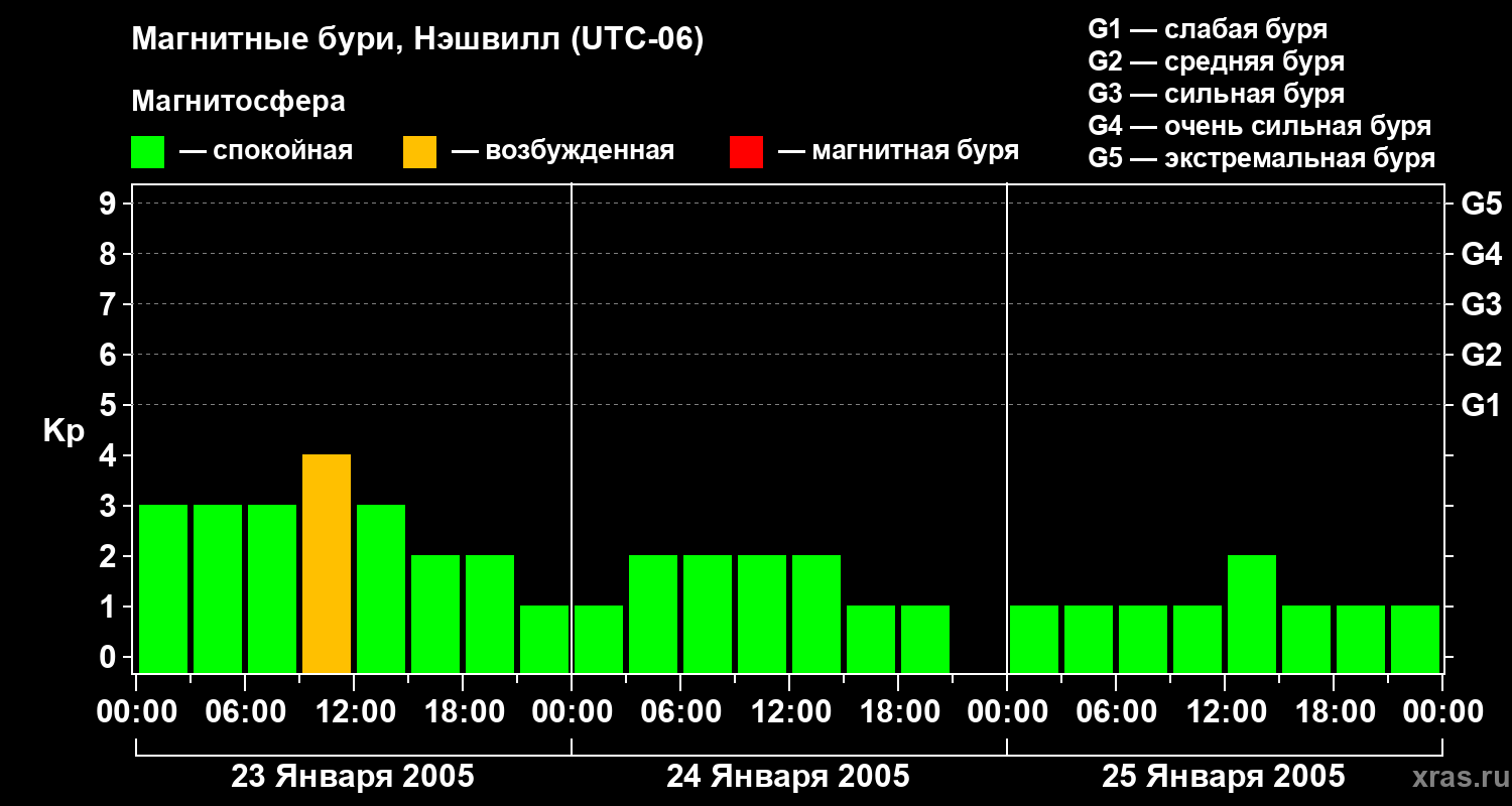 Изменения геомагнитного индекса Kp с 23 по 25 января 2005 года для средних широт