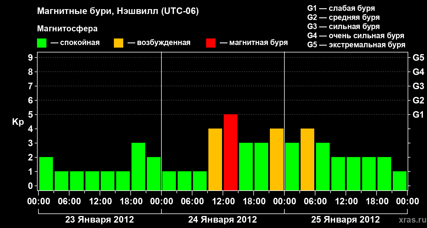 Изменения геомагнитного индекса Kp с 23 по 25 января 2012 года для средних широт