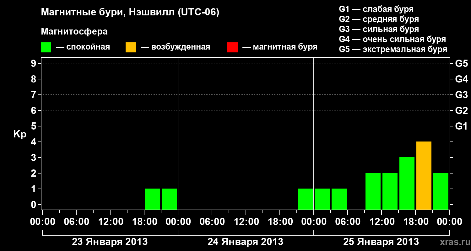 Изменения геомагнитного индекса Kp с 23 по 25 января 2013 года для средних широт