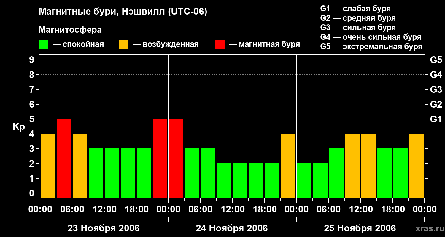 Изменения геомагнитного индекса Kp с 23 по 25 ноября 2006 года для средних широт