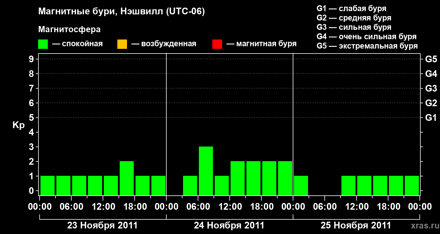 Изменения геомагнитного индекса Kp с 23 по 25 ноября 2011 года для средних широт