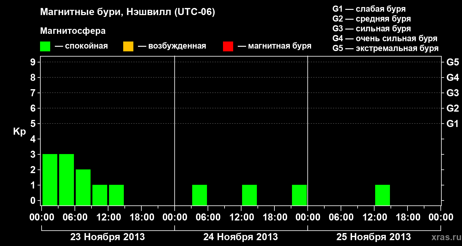 Изменения геомагнитного индекса Kp с 23 по 25 ноября 2013 года для средних широт
