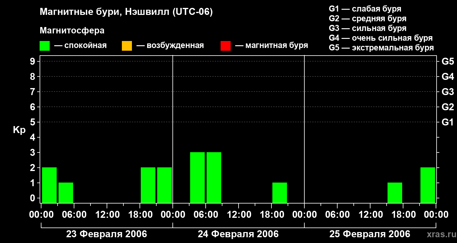 Изменения геомагнитного индекса Kp с 23 по 25 февраля 2006 года для средних широт