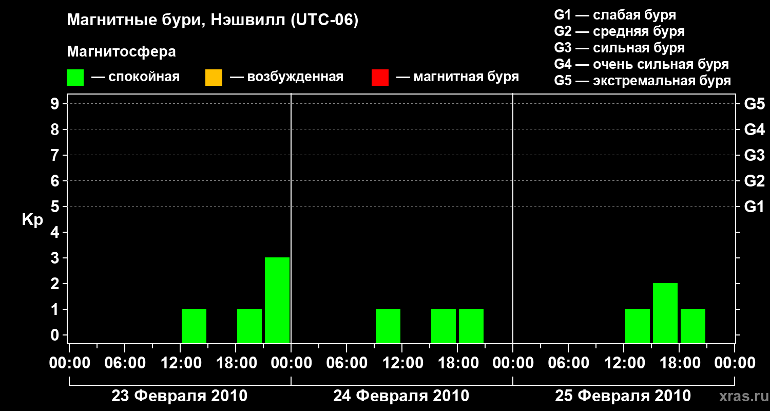Изменения геомагнитного индекса Kp с 23 по 25 февраля 2010 года для средних широт