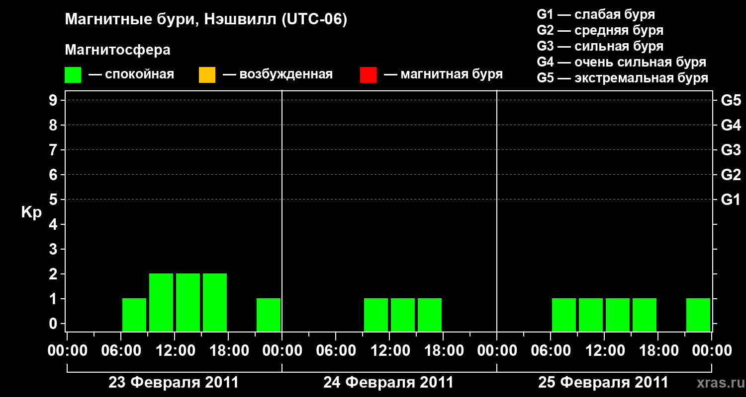 Изменения геомагнитного индекса Kp с 23 по 25 февраля 2011 года для средних широт
