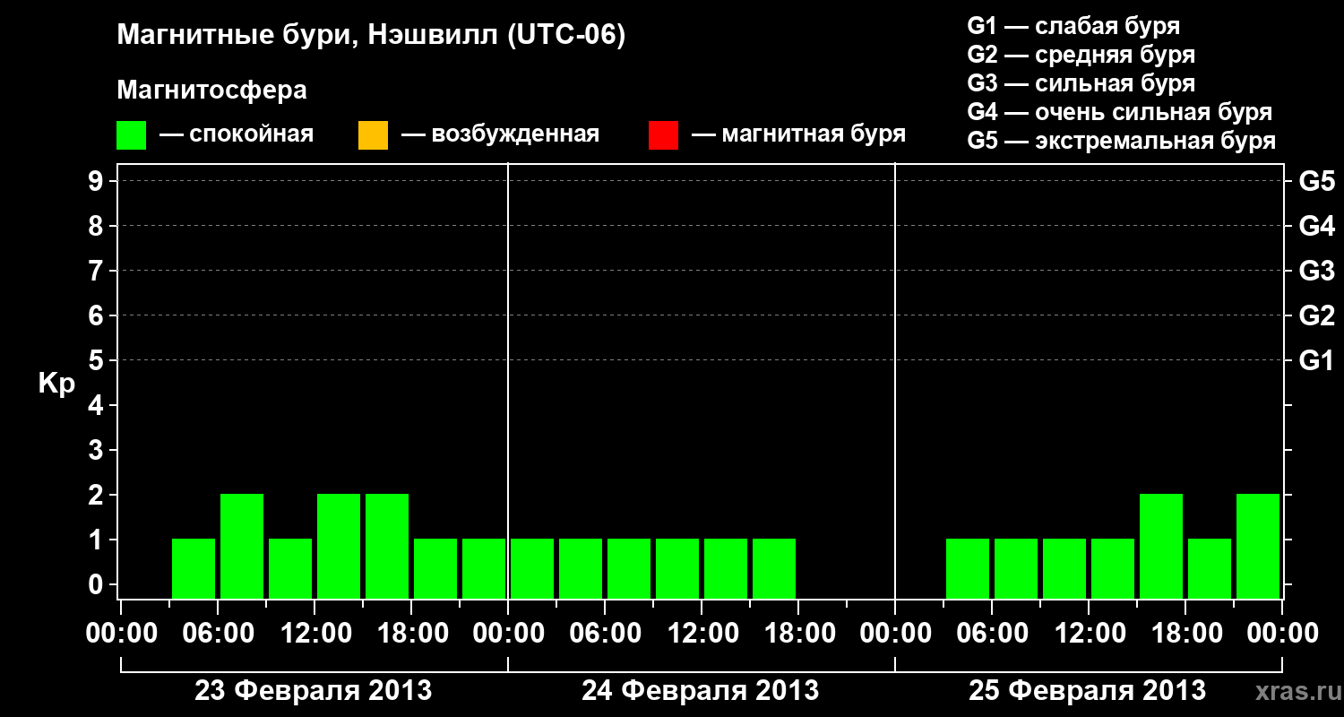 Изменения геомагнитного индекса Kp с 23 по 25 февраля 2013 года для средних широт
