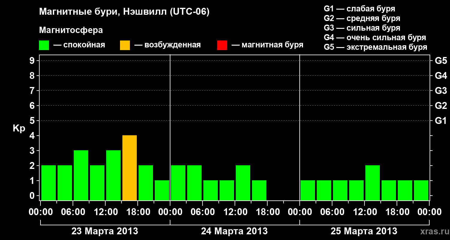 Изменения геомагнитного индекса Kp с 23 по 25 марта 2013 года для средних широт