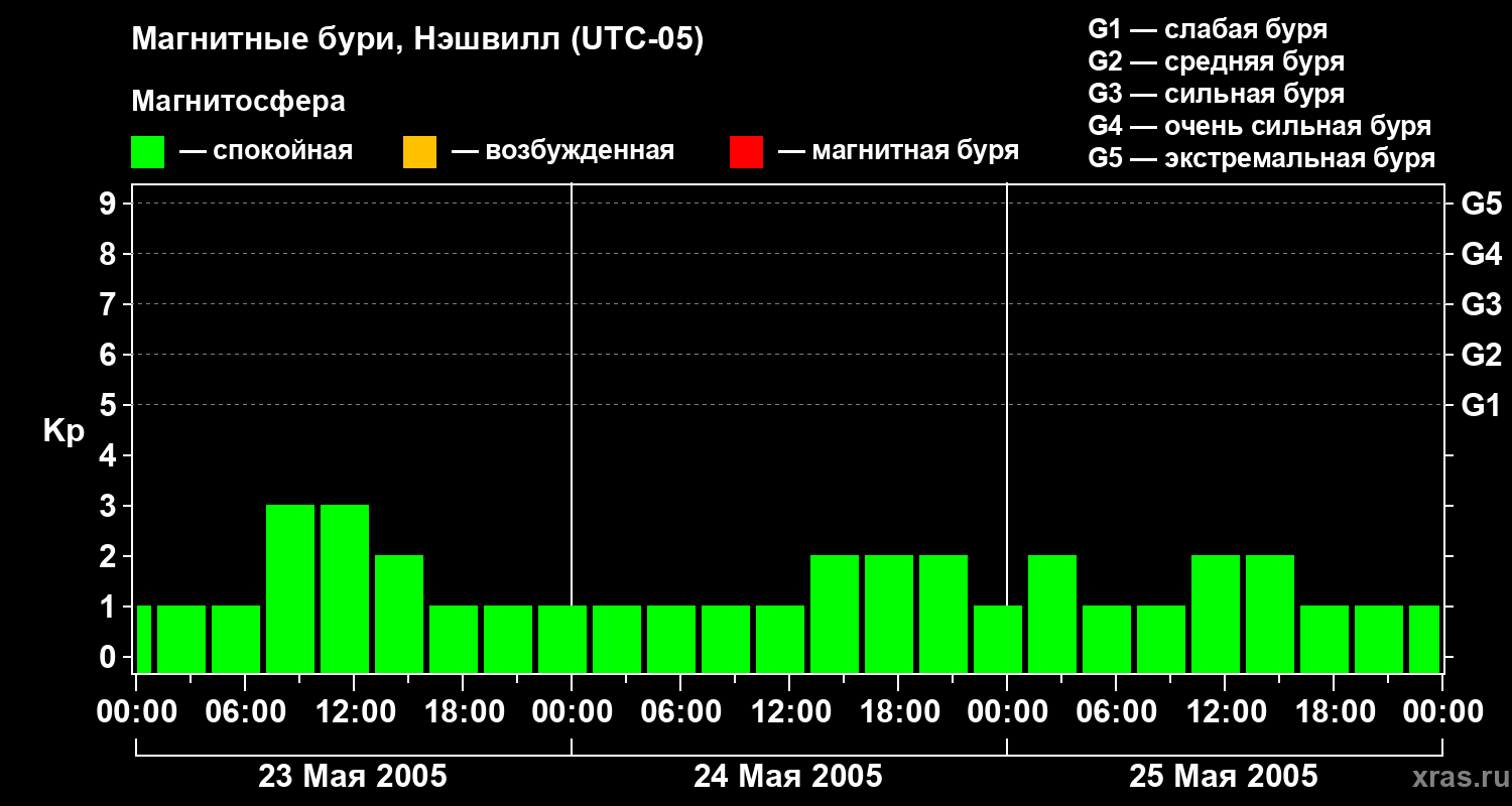 Изменения геомагнитного индекса Kp с 23 по 25 мая 2005 года для средних широт