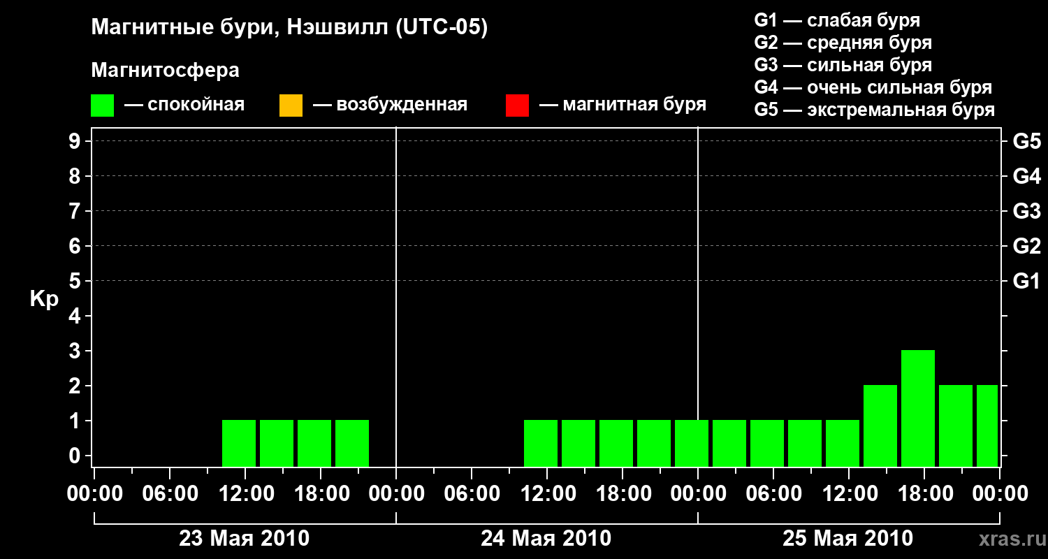 Изменения геомагнитного индекса Kp с 23 по 25 мая 2010 года для средних широт