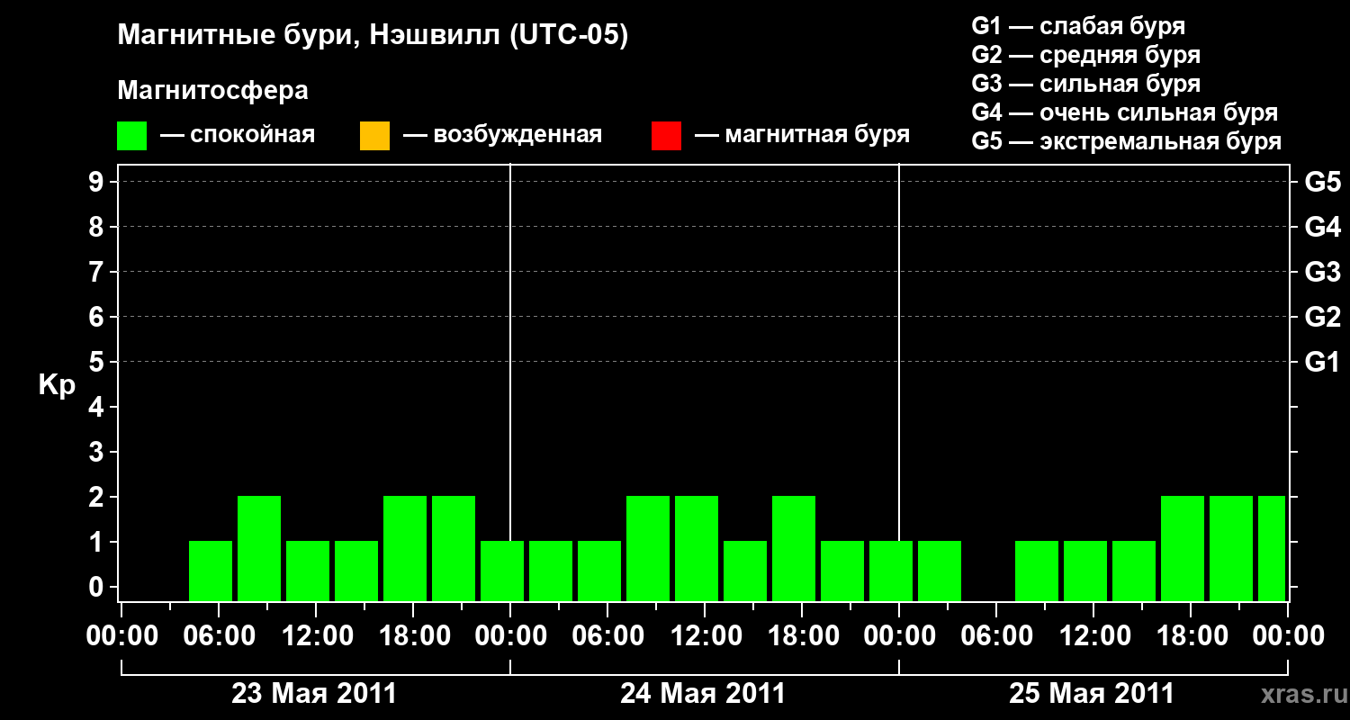 Изменения геомагнитного индекса Kp с 23 по 25 мая 2011 года для средних широт