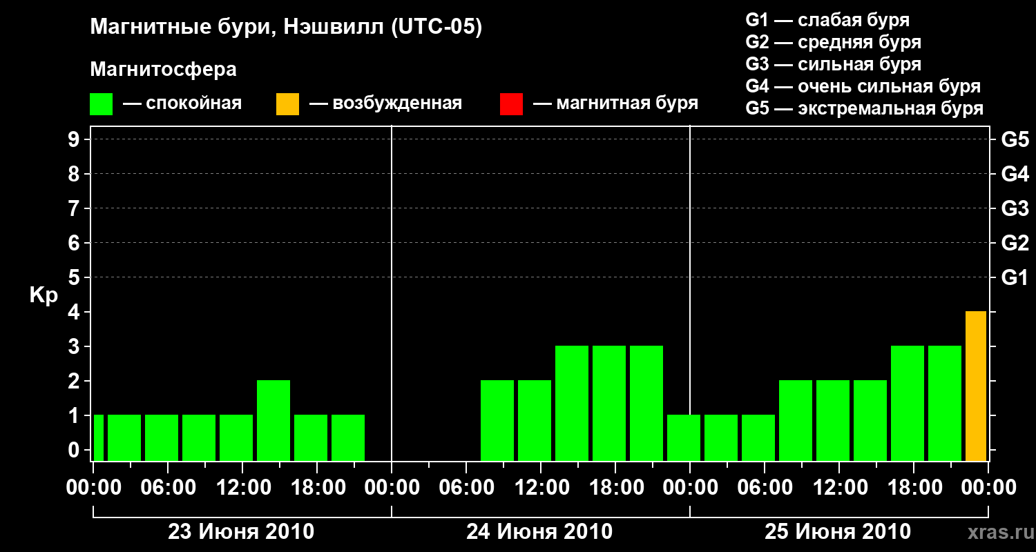 Изменения геомагнитного индекса Kp с 23 по 25 июня 2010 года для средних широт