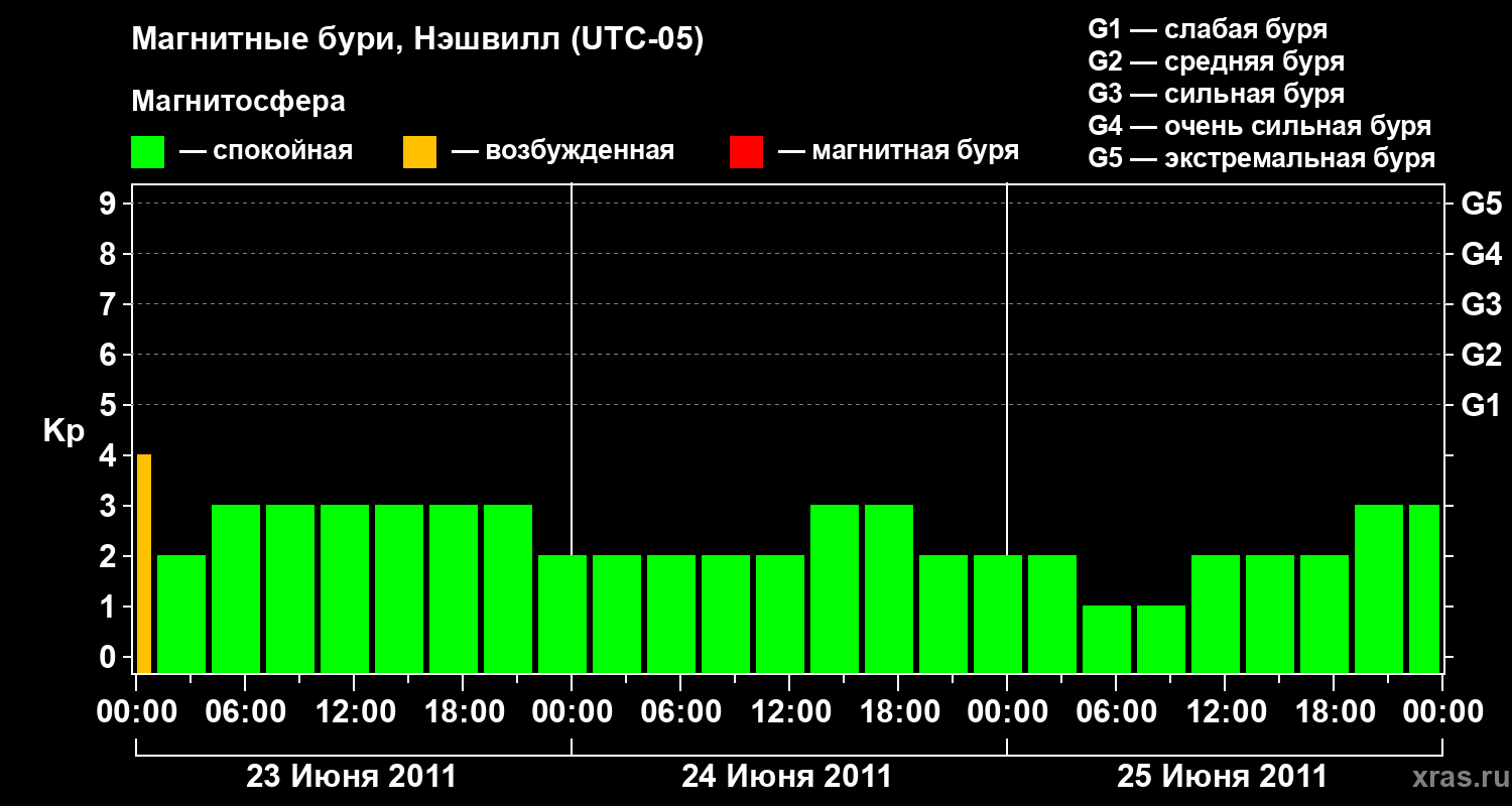 Изменения геомагнитного индекса Kp с 23 по 25 июня 2011 года для средних широт