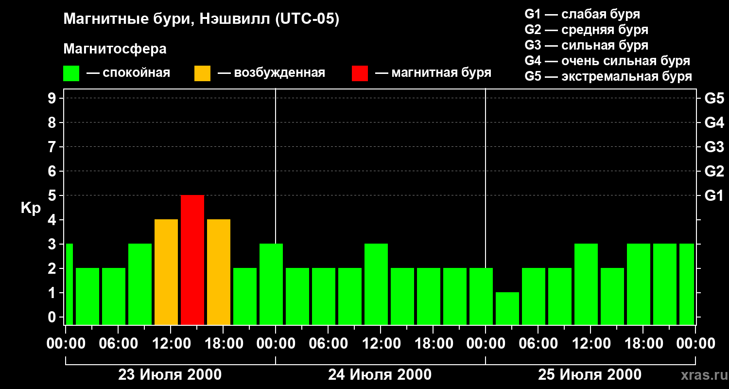 Изменения геомагнитного индекса Kp с 23 по 25 июля 2000 года для средних широт