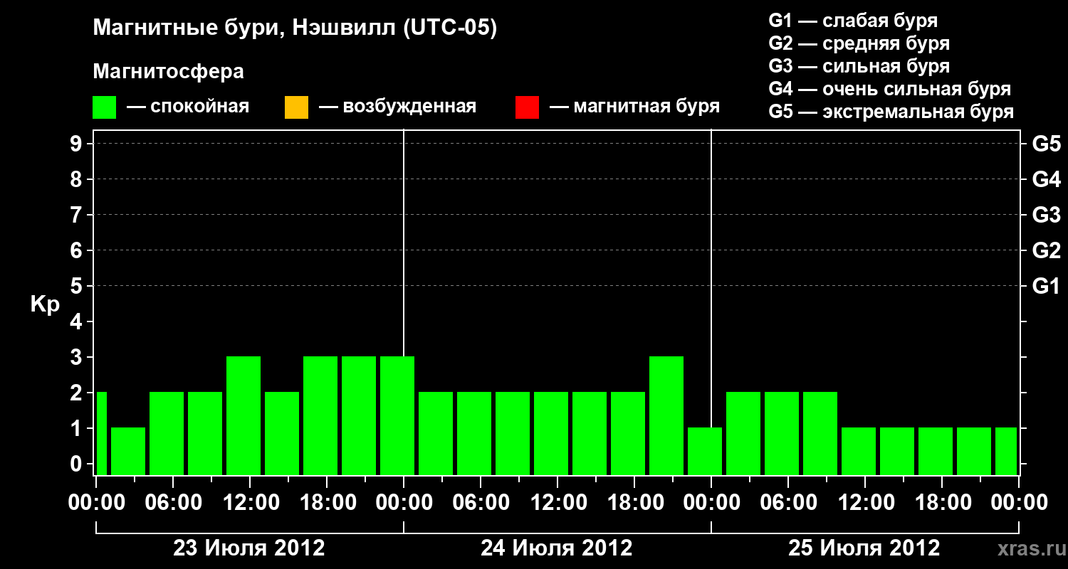 Изменения геомагнитного индекса Kp с 23 по 25 июля 2012 года для средних широт