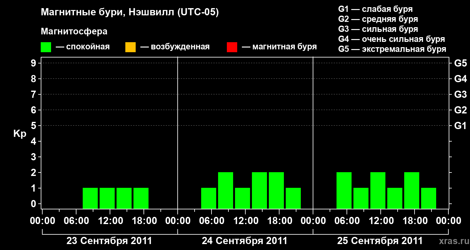 Изменения геомагнитного индекса Kp с 23 по 25 сентября 2011 года для средних широт