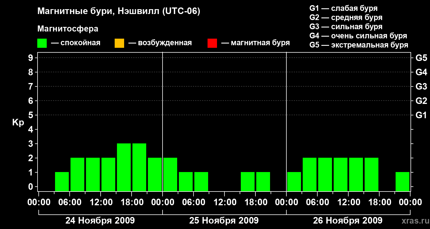 Изменения геомагнитного индекса Kp с 24 по 26 ноября 2009 года для средних широт