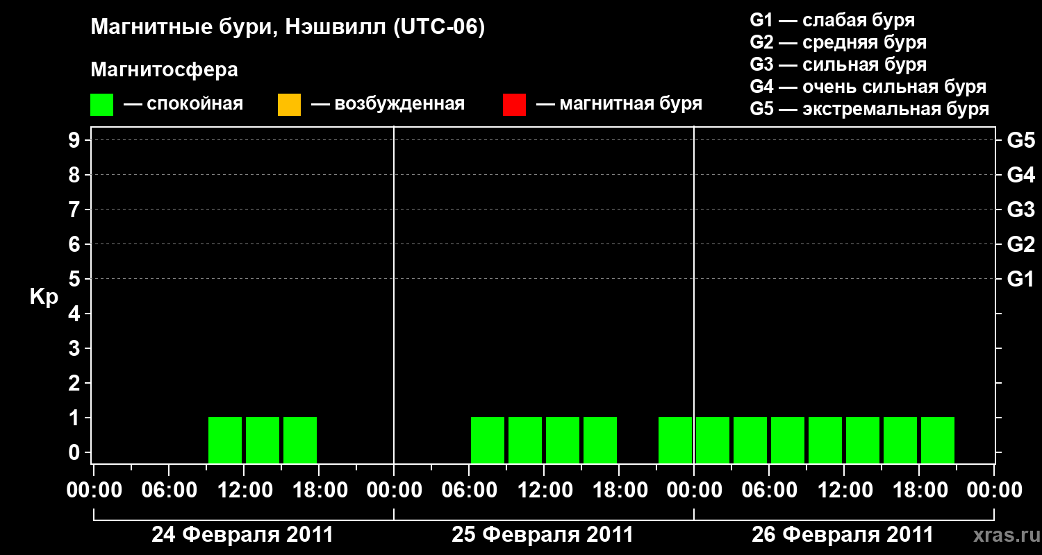 Изменения геомагнитного индекса Kp с 24 по 26 февраля 2011 года для средних широт