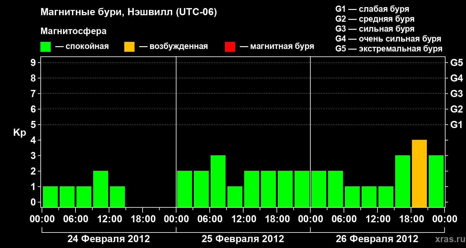 Изменения геомагнитного индекса Kp с 24 по 26 февраля 2012 года для средних широт