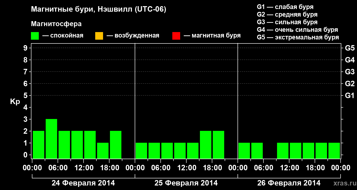 Изменения геомагнитного индекса Kp с 24 по 26 февраля 2014 года для средних широт