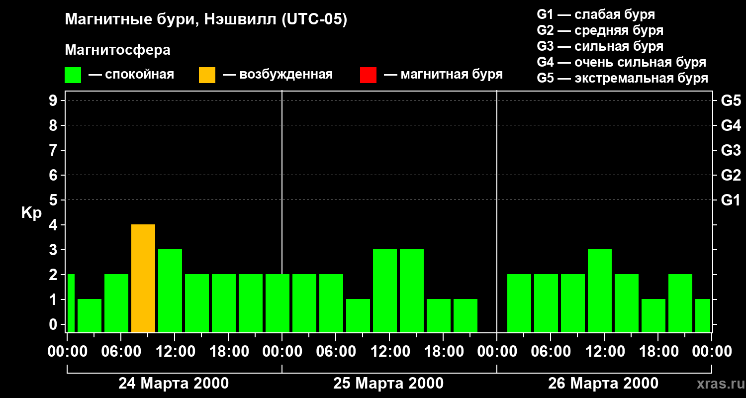 Изменения геомагнитного индекса Kp с 24 по 26 марта 2000 года для средних широт