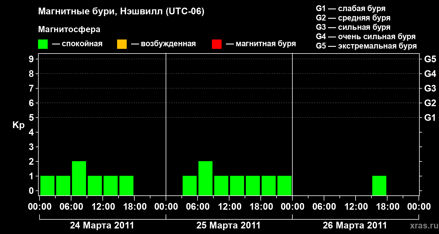 Изменения геомагнитного индекса Kp с 24 по 26 марта 2011 года для средних широт