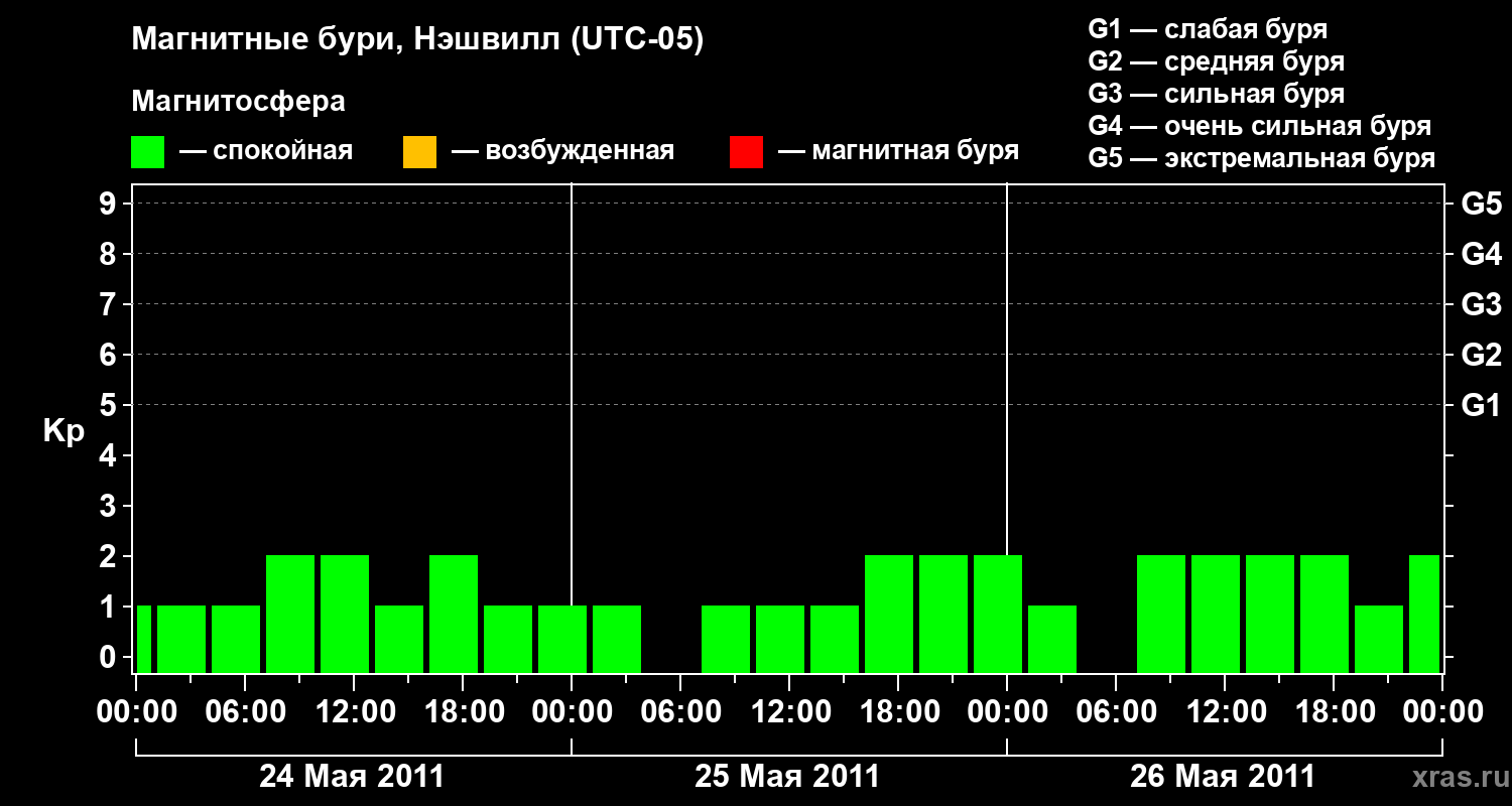 Изменения геомагнитного индекса Kp с 24 по 26 мая 2011 года для средних широт