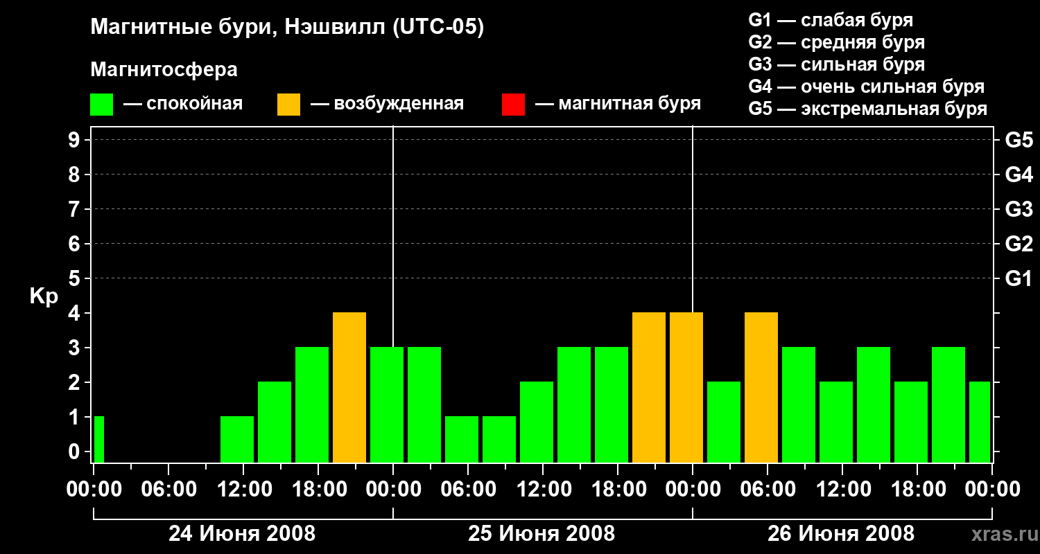 Изменения геомагнитного индекса Kp с 24 по 26 июня 2008 года для средних широт