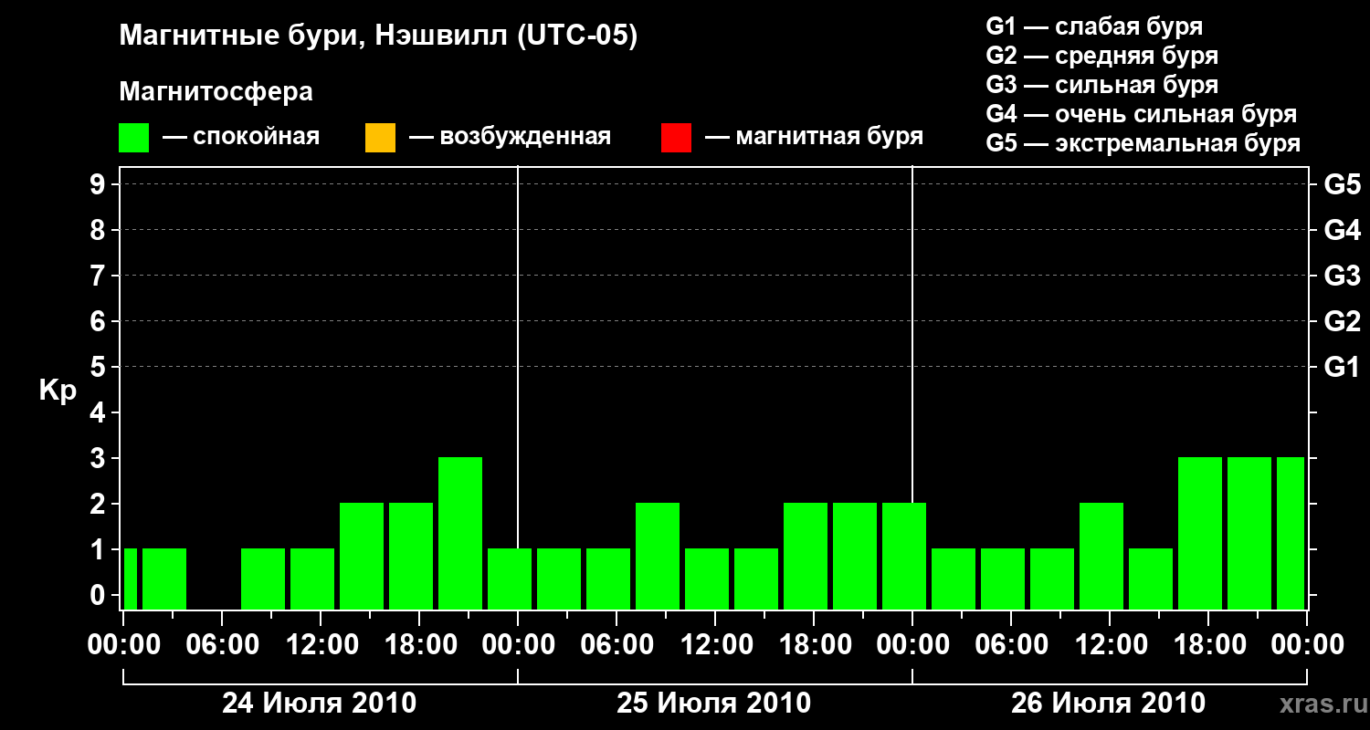 Изменения геомагнитного индекса Kp с 24 по 26 июля 2010 года для средних широт