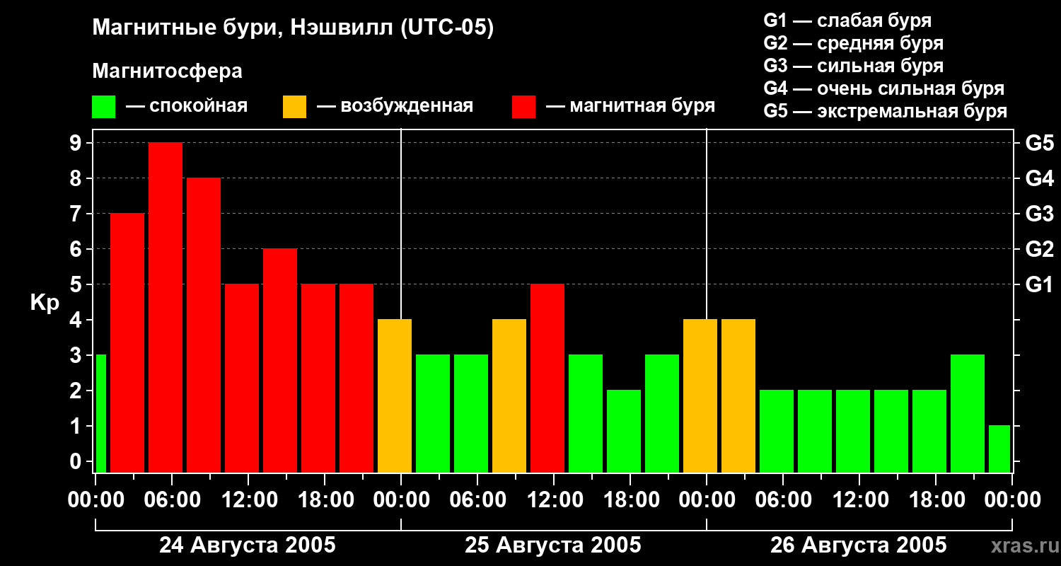 Изменения геомагнитного индекса Kp с 24 по 26 августа 2005 года для средних широт