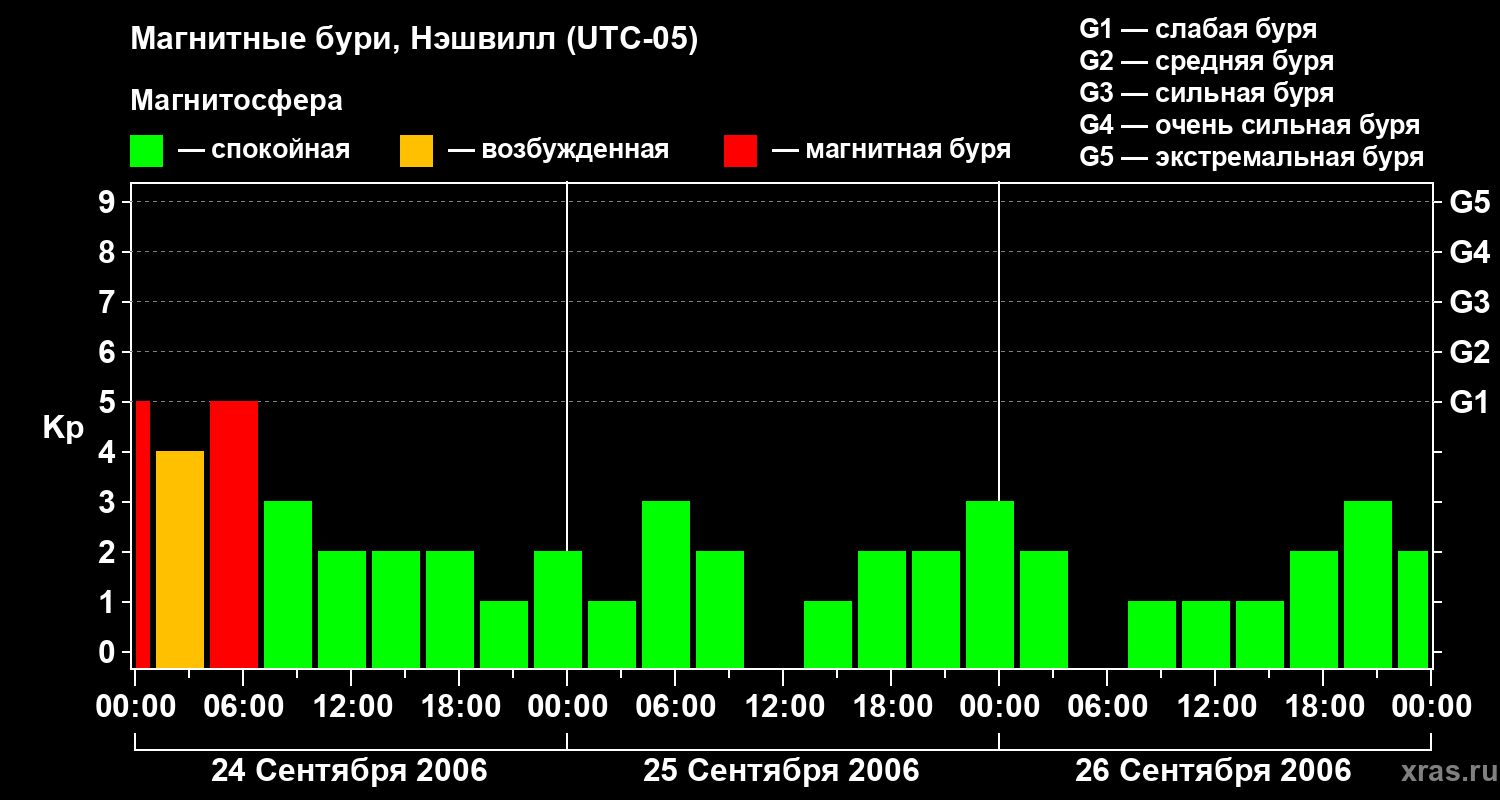 Изменения геомагнитного индекса Kp с 24 по 26 сентября 2006 года для средних широт