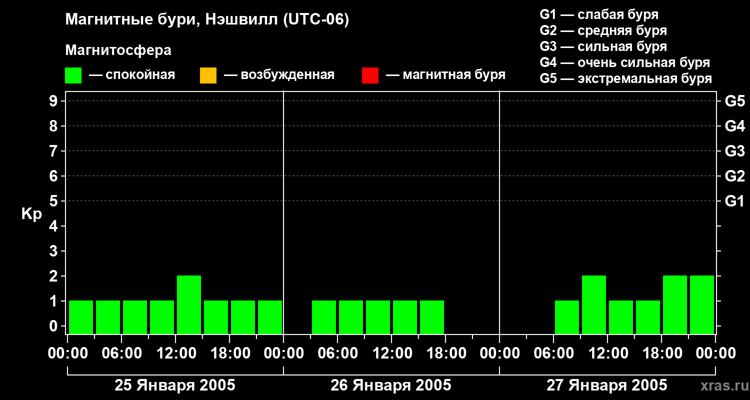 Изменения геомагнитного индекса Kp с 25 по 27 января 2005 года для средних широт