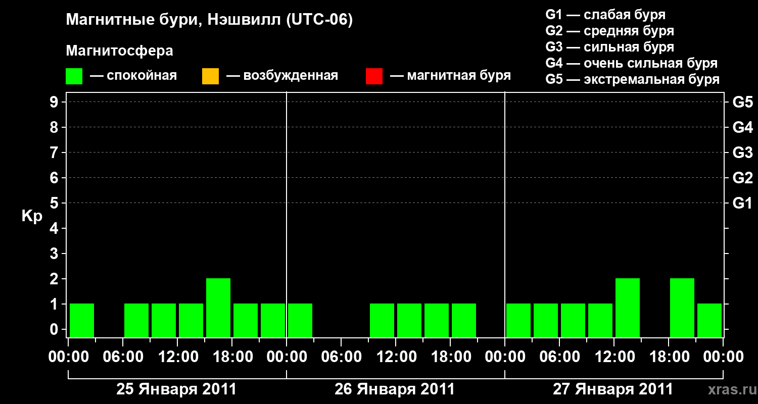 Изменения геомагнитного индекса Kp с 25 по 27 января 2011 года для средних широт