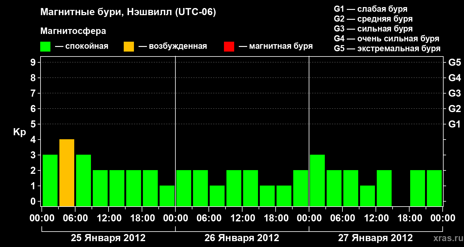 Изменения геомагнитного индекса Kp с 25 по 27 января 2012 года для средних широт