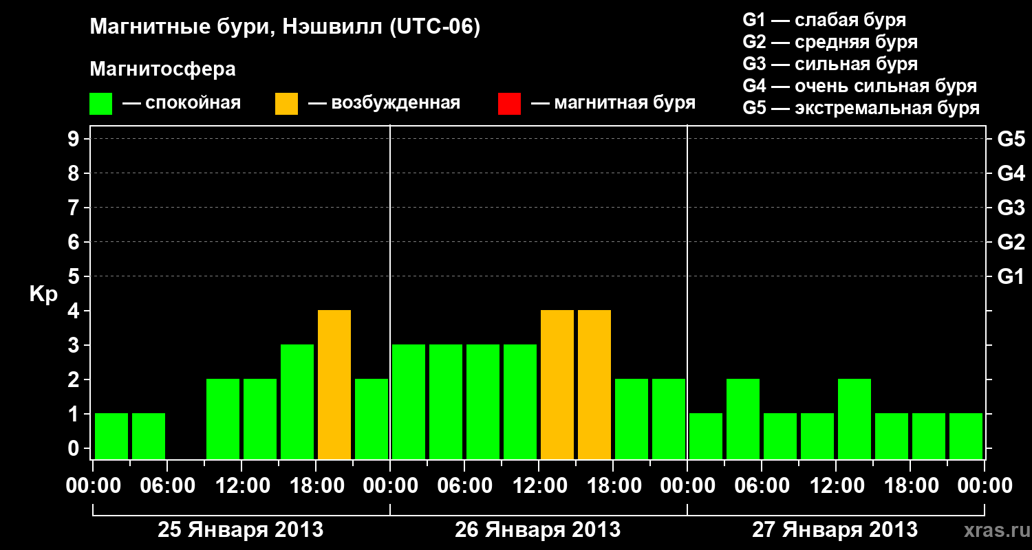 Изменения геомагнитного индекса Kp с 25 по 27 января 2013 года для средних широт