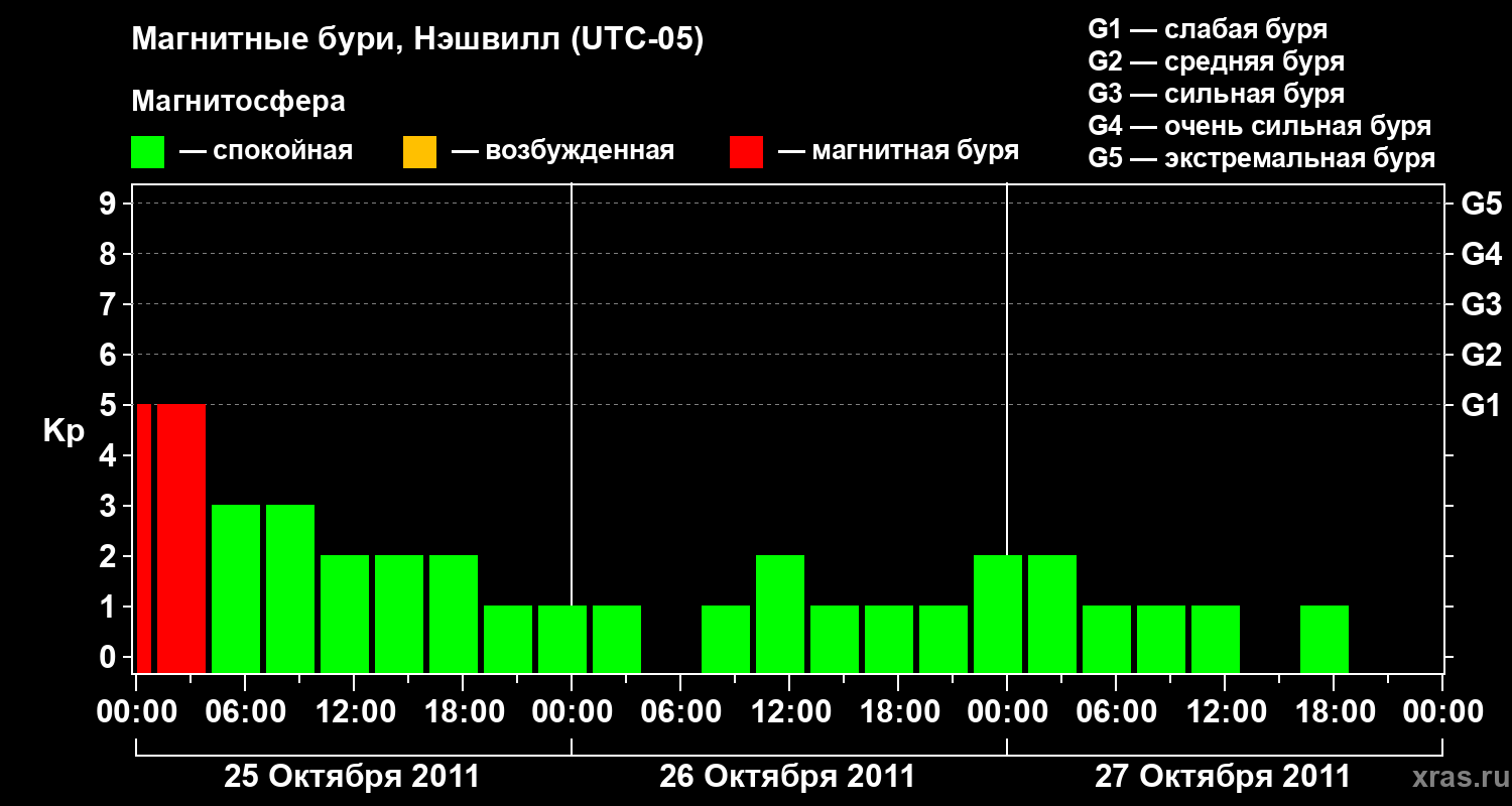 Изменения геомагнитного индекса Kp с 25 по 27 октября 2011 года для средних широт