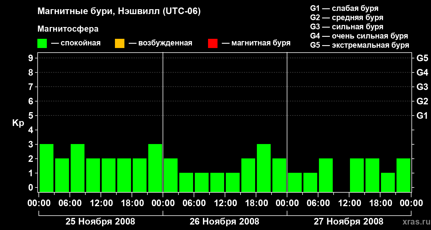 Изменения геомагнитного индекса Kp с 25 по 27 ноября 2008 года для средних широт