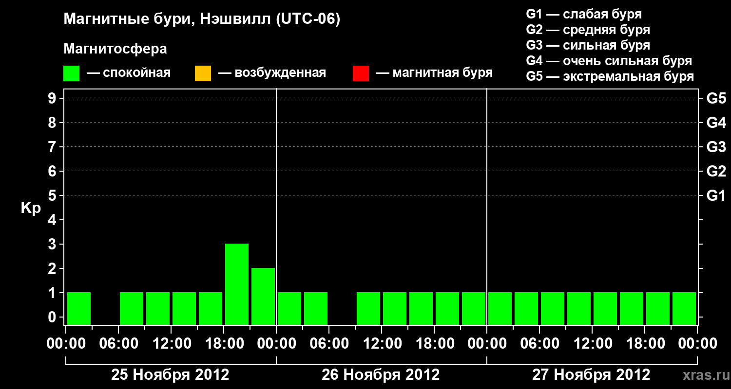 Изменения геомагнитного индекса Kp с 25 по 27 ноября 2012 года для средних широт