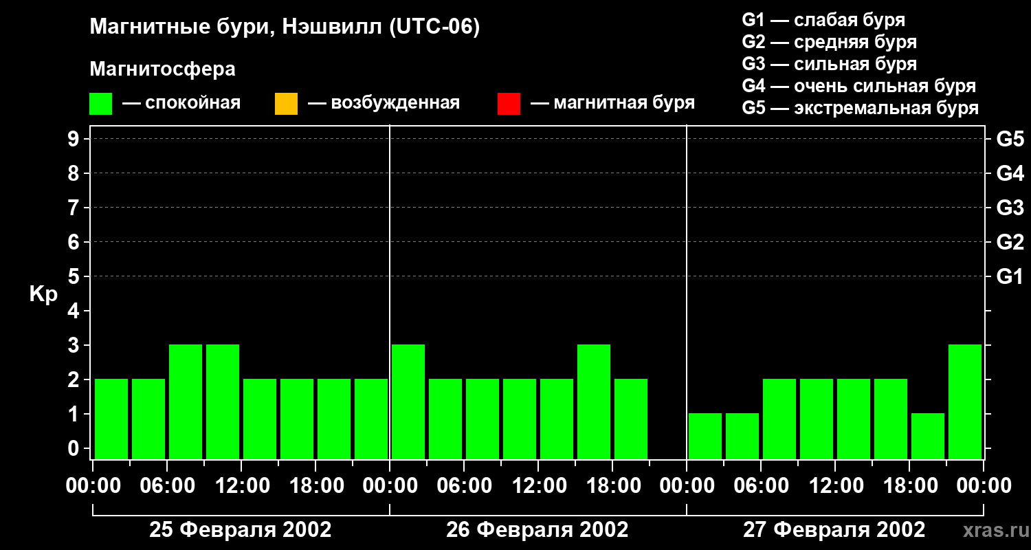 Изменения геомагнитного индекса Kp с 25 по 27 февраля 2002 года для средних широт