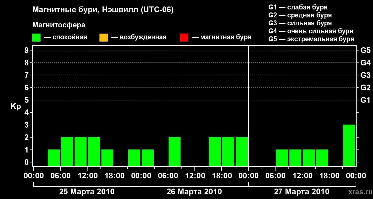 Изменения геомагнитного индекса Kp с 25 по 27 марта 2010 года для средних широт