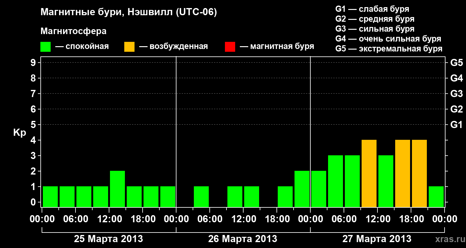 Изменения геомагнитного индекса Kp с 25 по 27 марта 2013 года для средних широт