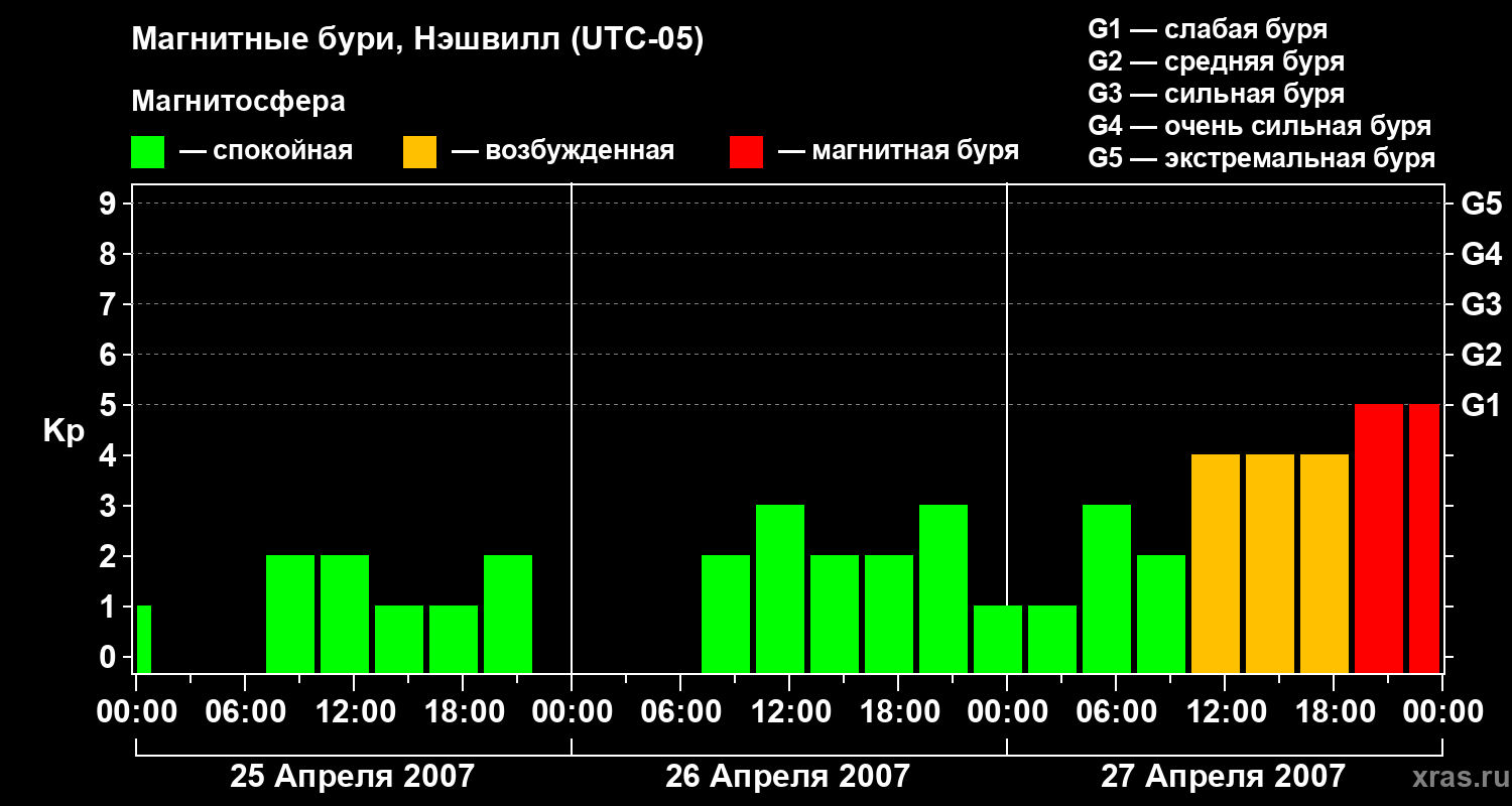 Изменения геомагнитного индекса Kp с 25 по 27 апреля 2007 года для средних широт