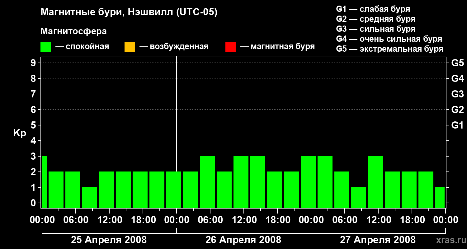 Изменения геомагнитного индекса Kp с 25 по 27 апреля 2008 года для средних широт
