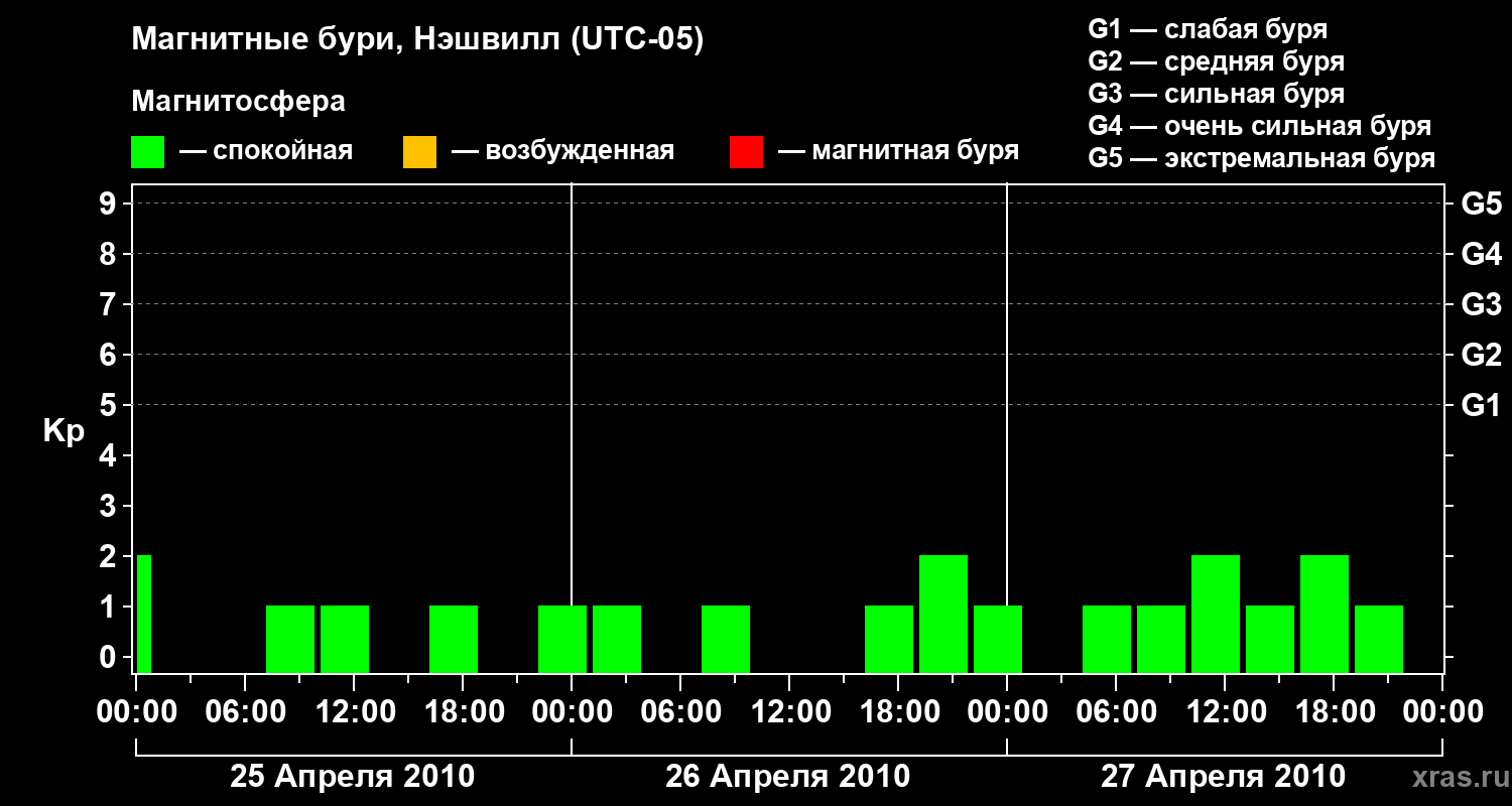Изменения геомагнитного индекса Kp с 25 по 27 апреля 2010 года для средних широт